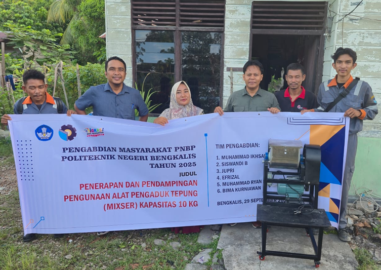Bengkalis, 29 September 2025 – Sebagai upaya nyata dalam meningkatkan produktivitas serta efisiensi Usaha Mikro Kecil dan Menengah (UMKM), Tim Pengabdian Politeknik Negeri Bengkalis baru-baru ini menyerahkan satu unit mesin Pengaduk/Mixer Adonan dengan kapasitas 10 kilogram kepada mitra UMKM Kuliner Habibah. Penyerahan mesin dilakukan langsung di lokasi usaha UMKM yang beralamat di Jalan Kelapapati Laut, Bengkalis.